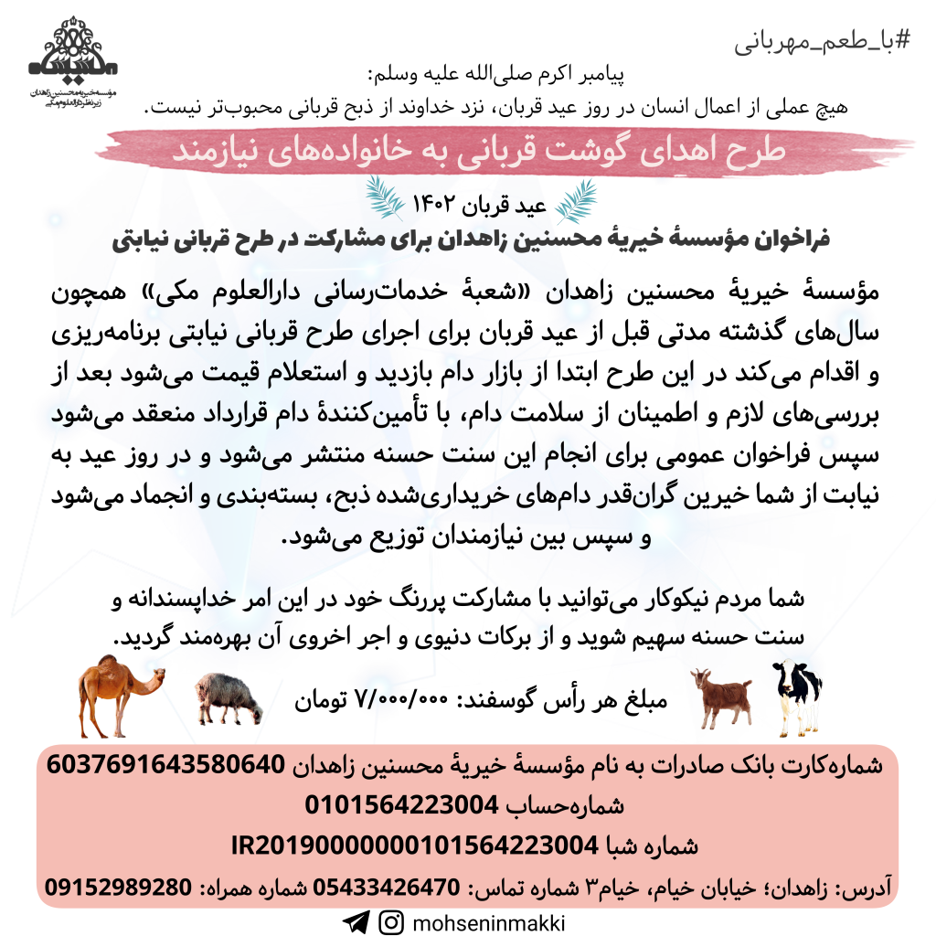 مؤسسهٔ خیریهٔ محسنین زاهدان همچون سال‌های گذشته مدتی قبل از عید قربان برای اجرای طرح قربانی نیابتی برنامه‌ریزی و اقدام می‌کند در این طرح ابتدا از بازار دام بازدید و استعلام قیمت می‌شود بعد از بررسی‌های لازم و اطمینان از سلامت دام با تأمین‌کنندهٔ دام قرارداد منعقد می‌شود سپس فراخوان عمومی برای انجام این سنت حسنه منتشر می‌شود و در روز عید به نیابت از شما خیرین گران‌قدر دام‌های خریداری‌شده ذبح، بسته‌بندی و انجماد می‌شود و سپس بین قشر نیازمند و مستمند توزیع می‌شود.