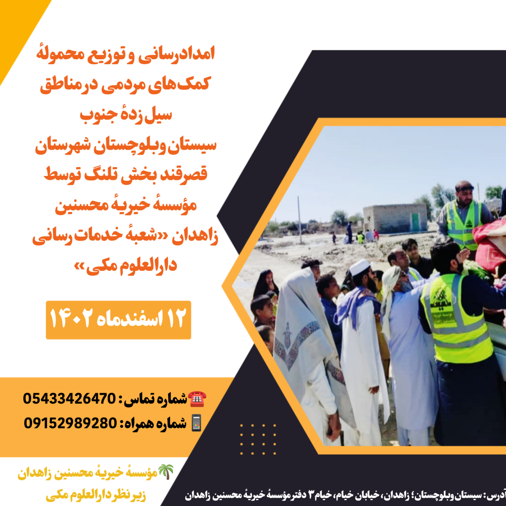 شما مردم عزیز میتوانید کمکهای نقدی و غیرنقدی (اقلام خوراکی، بهداشتی و سایر کمکهای اضطراری) را به مؤسسهٔ خیریهٔ محسنین زاهدان «شعبهٔ خدماترسانی دارالعلوم مکی» برسانید تا با توفیق خداوند در اسرع وقت امدادرسانی به مردم آسیبدیده انجام شود.