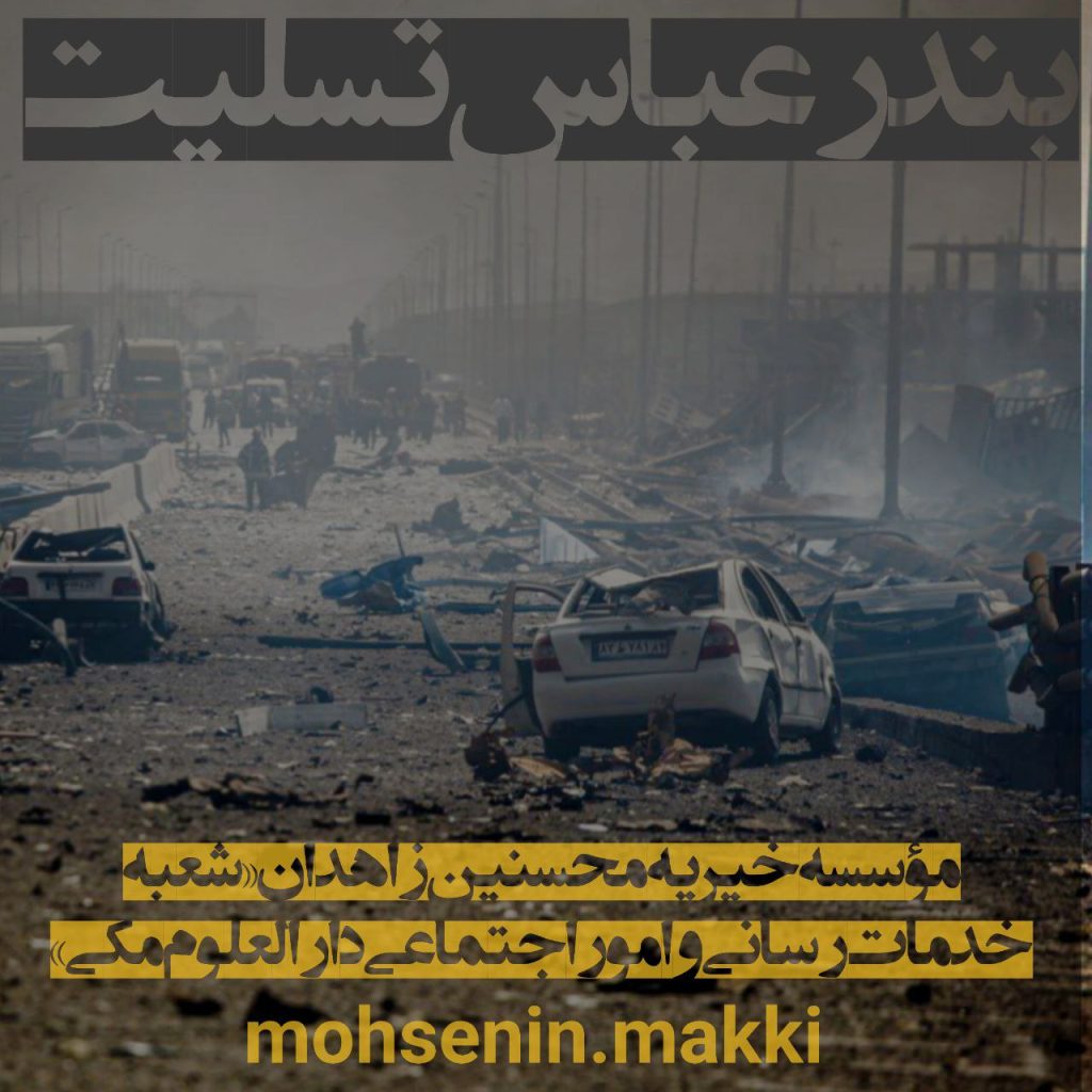 حادثه‌ی دردناک انفجار در بندر شهید رجایی بندرعباس، ضایعه‌ای جانکاه بر پیکره‌ی میهن وارد ساخت. نهاد مردمی خیریه‌ی محسنین زاهدان «شعبه خدمات‌رسانی و امور اجتماعی دارالعلوم مکی»، با دلی آکنده از اندوه، این واقعه‌ی غم‌انگیز را به ملت شریف ایران، مردم عزیز بندرعباس، و خانواده‌های مصیبت‌دیده تسلیت عرض می‌کند.