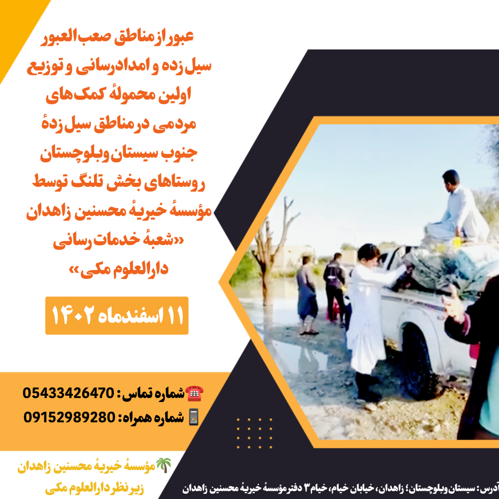 عبور از مناطق صعبالعبور سیلزده و امدادرسانی و توزیع اولین محمولهٔ کمکهای مردمی در مناطق سیلزدهٔ جنوب سیستانوبلوچستان روستاهای بخش تلنگ توسط مؤسسهٔ خیریهٔ محسنین زاهدان «شعبهٔ خدماترسانی دارالعلوم مکی»