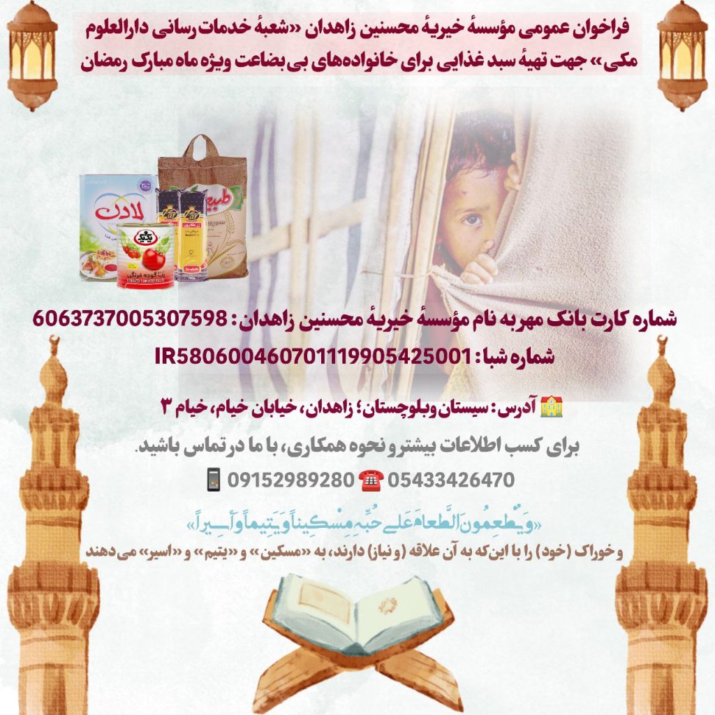 فراخوان عمومی مؤسسهٔ خیریه محسنین زاهدان «شعبهٔ خدماترسانی دارالعلوم مکی» جهت تهیهٔ سبد غذایی برای خانوادههای بیبضاعت ویژه ماه مبارک رمضان