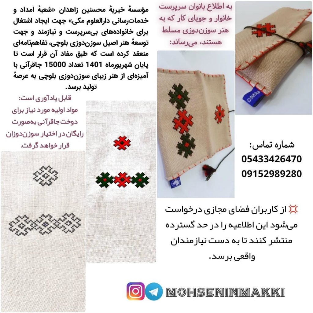 مؤسسهٔ خیریهٔ محسنین زاهدان «شعبهٔ امداد و خدماترسانی دارالعلوم مکی» جهت ایجاد اشتغال برای زنان سرپرست خانوار و جویای کار و توسعهٔ هنر زیبای سوزندوزی بلوچی، تفاهمنامهای منعقد کرده است که طبق مفاد آن قرار است تا پایان شهریورماه 1401 تعداد 15000 جاقرآنی با آمیزهای از هنر زیبا و اصیل سوزندوزی بلوچی به عرصهٔ تولید برسد.