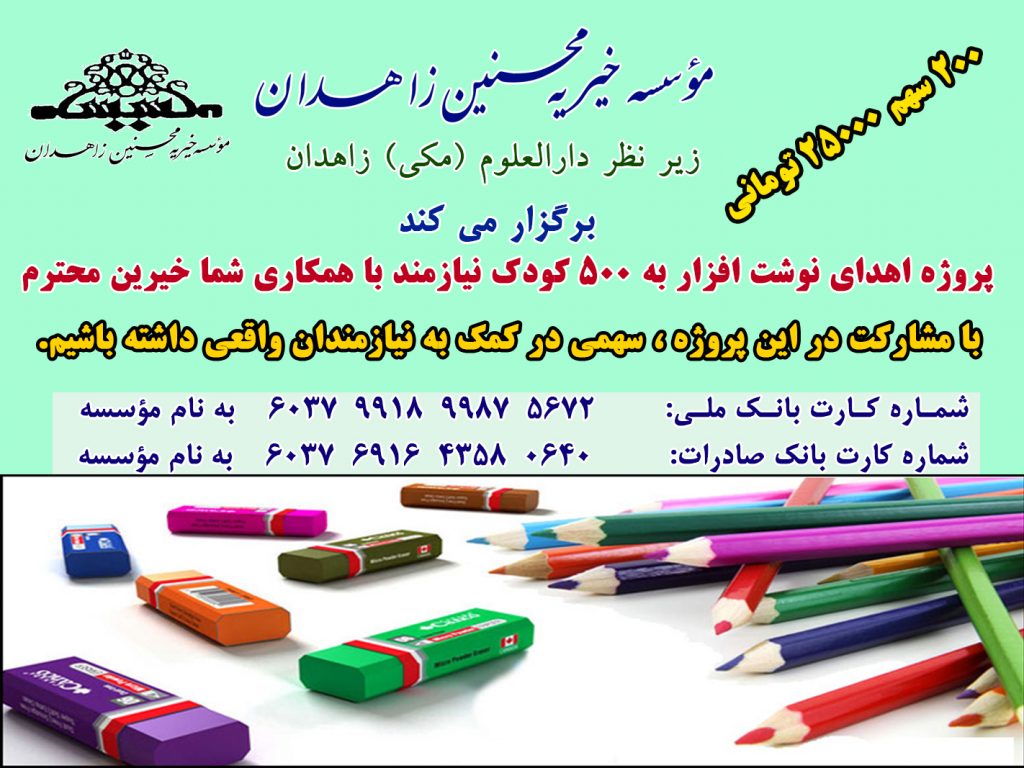 این طرح برای اهدای نوشت افزار به 500 کودک نیازمند و با مشارکت شما خیرین محترم اجرا خواهد شد. إن شاءالله